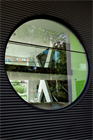 Okna z mezipodesty schodiště jsou pevně zasklená s rámem osazeným do líce fasády. Na sklo jsou nalepeny průsvitné fólie potisknuté obrázky zvětšenin z mikroskopů. Obrázky jsou dobarveny jasnými barvami různými pro jednotlivá podlaží. Zvětšeniny na sklech jsou viditelné zvenku i zevnitř z hlavního schodiště a navíc ještě z výtahu, kdy černě lakovaná skla obkladu schodišťové šachty jsou v místech podest opatřena kulatými průhlednými otvory v laku a tím jsou obrazy na sklech vnímány i v pohybu při průjezdu výtahem - jakýsi přepis pozorování v mikroskopu.