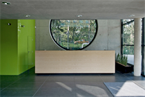 Vstupní hala je vysoký prosklený prostor téměř přes dvě patra s kulatým oknem za recepcí. Stejný prvek kulatého okna je použit ve vyložené hmotě 2.NP. Tvar uplatněných oken odkazuje na design výrobků firmy Tescan - mikroskopů. Ve vstupní hale se uplatňuje ještě jeden výrazný prvek - sloup ve tvaru písmene X vedle schodiště.